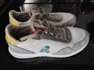Usadas, pero en buen estado 44 Zapatillas deportivas con un diseño moderno y detalles únicos. - Combinación de colores beige, marrón y verde. - Detalle de calavera en el lateral. - Cordones grises.