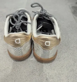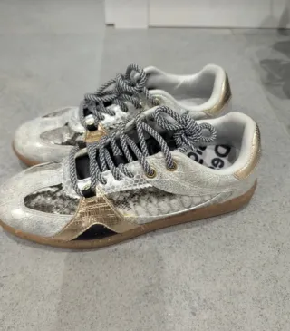 Zapatillas de estilo retro con un diseño llamativo. - Combinación de colores dorado y plateado. - Detalle de textura imitando piel de serpiente. - Cordones grises con patrón. - Suela de goma marrón.