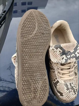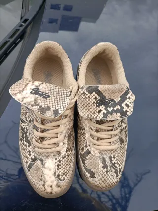 Zapatillas de moda con un llamativo estampado. - Diseño inspirado en piel de serpiente. - Combinación de colores beige y gris. - Cordones a tono.