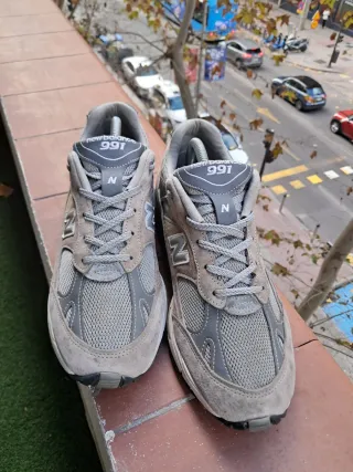 Zapatillas deportivas New Balance en tonos beige y gris. - Diseño clásico y versátil. - Detalle del logo 'N' en los laterales. - Número de modelo '991' visible en la lengüeta.