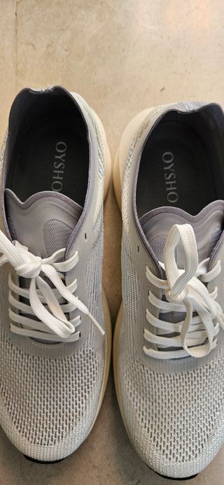 Zapatillas deportivas de Oysho en tonos grises y blancos. Perfectas para el día a día o para hacer deporte. - Diseño moderno y ligero. - Cierre con cordones blancos. - Suela de goma. Modelo ortholyte, sin uso