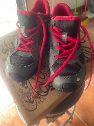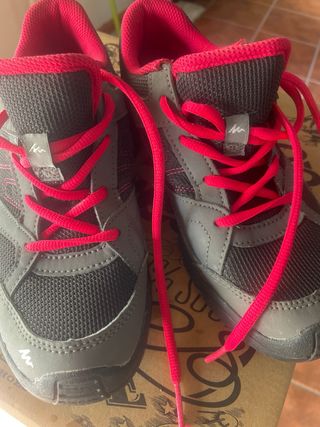 Zapatillas de montaña y senderismo para mujer de la marca Quechua. - Color gris con detalles en rojo. - Cierre con cordones. - Diseño deportivo y funcional.