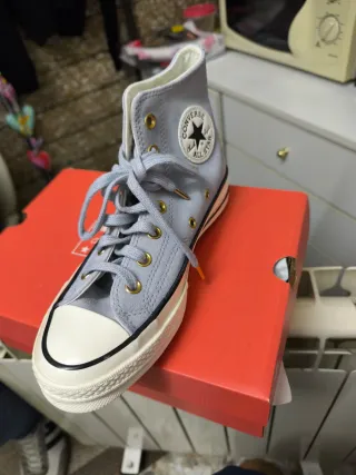 Zapatillas Converse altas de color gris. Son de ante y con tachuelas en la parte posterior. - Modelo bota alta. - Cordones grises.