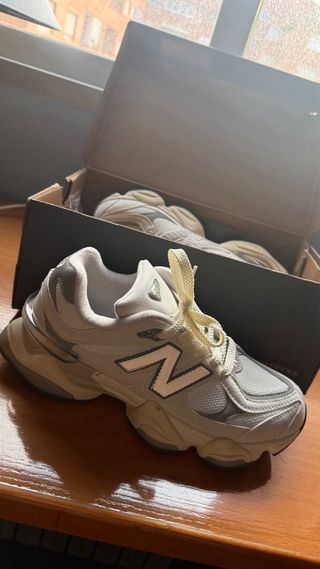 Zapatillas New Balance 9060 en tonos beige y gris. Diseño moderno y cómodo. ( las compré en una tienda de Instagram online) no son las New balance 90 60 la talla las zapatillas es una 39 pero talla pequeño a mí me van justas por eso las vendo sería más hacia una 38 solo me las he puesto una vez porque me pretan
