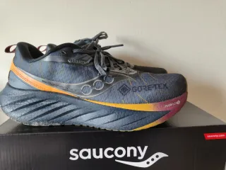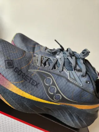 Zapatillas Saucony Triumph con tecnología Gore-Tex. 7.5 usa . Escaso uso como se puede observar .solo andando no corriendo. - Diseño en tonos grises y detalles amarillos.. Amortiguación powerun pb.reactiva y ligera. Pvp 169 euros .