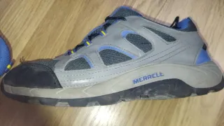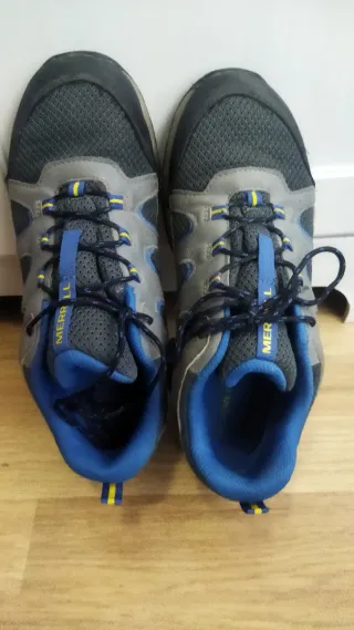 Zapatillas deportivas Merrell en tonos grises y azules. Perfectas para senderismo o uso diario. - Cierre con cordones. - Detalle de logo en la lengüeta. - Suela de goma. - Talla 38
