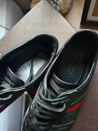 Zapatillas de la marca Gucci en color negro. Presentan un diseño deportivo y elegante. - Detalle de franjas laterales. - Cierre con cordones. - Materiales de calidad. tiene un poco desgastado las suelas que se ve en la foto, pero están bien y no hay rotos ni nada raro. muy cómodas y bonitas, las vendo porque no me las pongo.