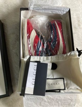 Zapatillas de la marca Gucci con el diseño de tribanda característico. - Diseño de tribanda. - Combinación de colores rojo y blanco.