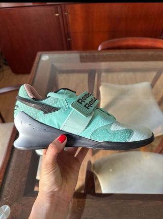 Zapatillas Reebok Legacy Lifter II en color verde azulado. Específicas para el entrenamiento de levantamiento de pesas y halterofilia. Están nuevas. Las he usado 3 veces. Dejé de hacer crossfit y las escondí... en las imágenes se aprecia que no tienen ni un rasguño.