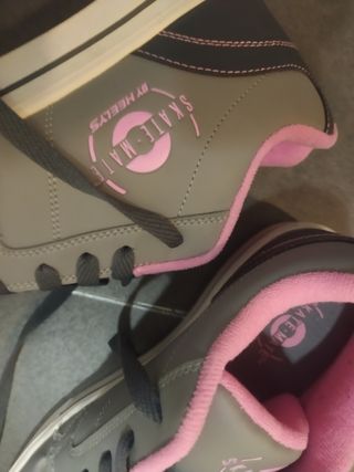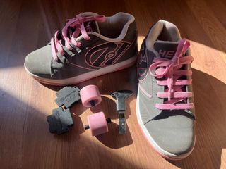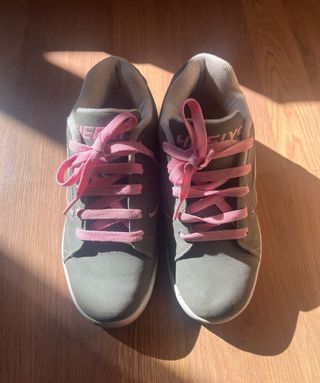 Vendo un par de zapatillas Heelys en color gris y rosa. Talla 36.5. Están en buen estado, aunque muestran señales normales de uso. - Incluyen la tapa, dos ruedas y una llave Allen para cambiarlas.