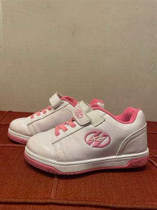 Zapatillas Heelys con dos ruedas, en buen estado. Perfectas para deslizarse y divertirse. - Diseño en blanco con detalles en rosa. - Cierre de velcro y cordones. - Incluye herramienta para cambiar las ruedas. - Solo le falta una tapa de una rueda.