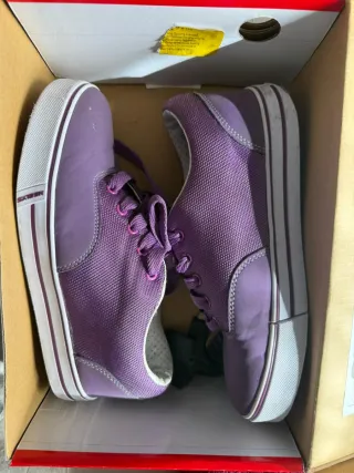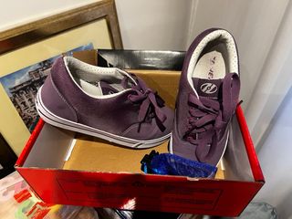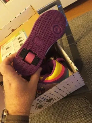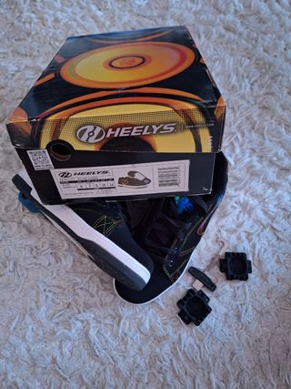 Zapatillas con ruedas Heelys, poco uso. Talla Eur 38 prácticamente nuevas excepto algun roce en las punteras al usarse como patin, por la frenada. Como se ve, las suelas y el interior nuevas, sin desgastes ya que se usarían un par de veces. En general, xcelente esado.
