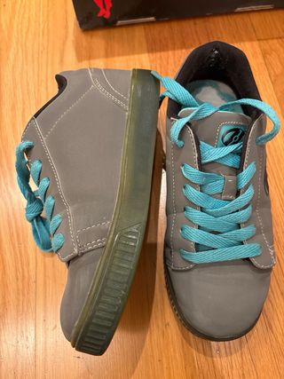 Zapatillas Heelys con ruedas en talla 36. - Color gris con detalles en turquesa. - Cierre con cordones. Las zapatillas por fuera están en muy buen estado aunque por dentro la parte del talón está desgastada (ver foto). Incluye las 2 ruedas y la pieza para ponerlas y quitarlas.