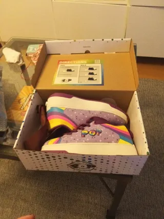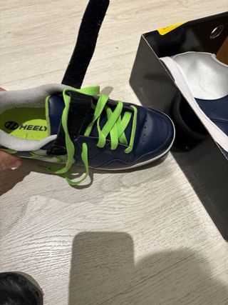 Completamente nuevas, las probó en casa y no supo utilizarlas y han estado guardadas hasta que ya se han quedado pequeñas. Se pueden poner y quitar las ruedas, trae el accesorio para ello y unas tapas. Se puede poner una rueda o dos en cada zapatilla. Los cordones son de goma, no es necesario atar