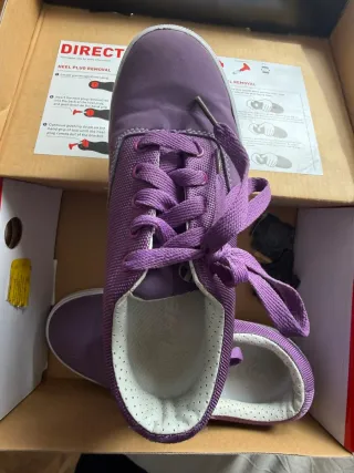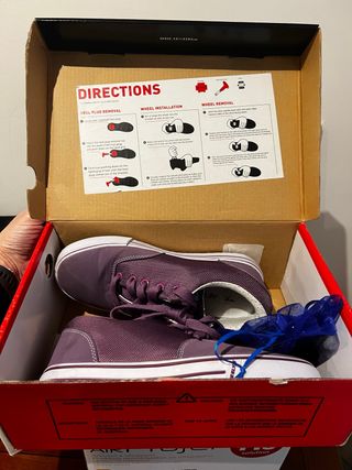 Zapatillas Heelys con ruedas, color morado. - Incluye instrucciones para el cambio de ruedas. - Bolsa de tela azul para guardar las ruedas.