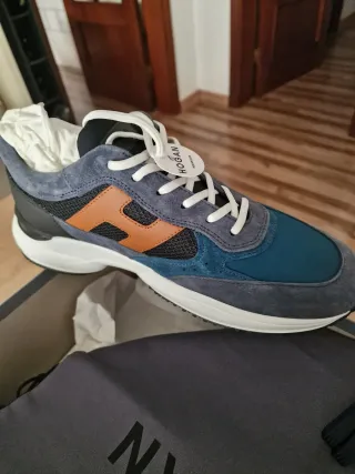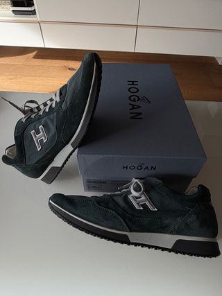 Zapatillas Hogan en excelente estado, casi nuevas. - Talla 43 (equivalente a 9). - Color gris y verde azulado. - Diseño deportivo y moderno.
