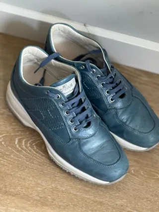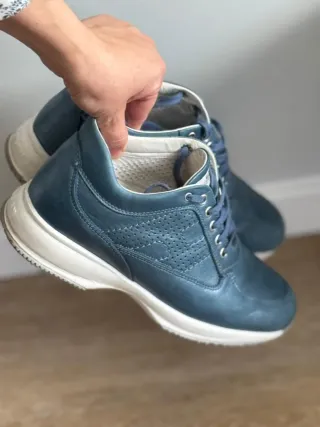 Zapatillas Hogan de mujer, talla 38.5, en muy buen estado. Modelo clásico en piel azul con detalles troquelados y suela cómoda, ideal para el uso diario.