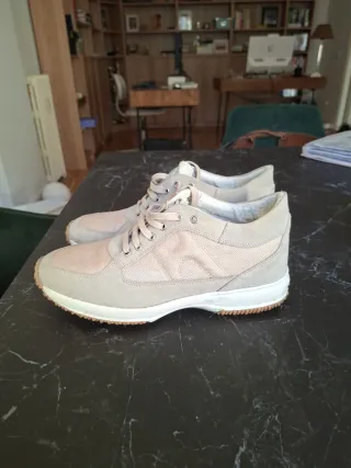 Zapatillas Hogan de ante y tela. Las he usado dos veces, no son mi talla. - Combinación de ante beige y tela r - Cordones a tono.