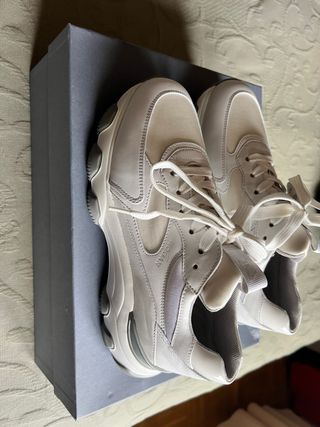 Zapatillas de la marca Hogan en tonos blanci y plateado. Un diseño moderno y versátil. Compradas en Suecia por 450€. Usadas una vez. - Detalle plateado en el talón. - Logo de la marca en el lateral.