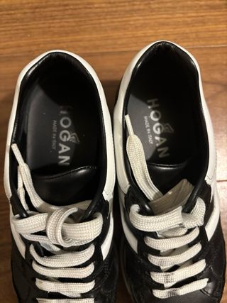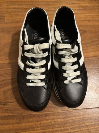 Vendo zapatillas de la marca de lujo Hogan, fabricadas en Italia con piel de primera calidad. Son extremadamente cómodas y elegantes, ideales tanto para un look casual como para ir a la oficina. • Modelo: Sneaker clásica con logo lateral. • Talla: 34.5 (34 y medio). Importante: Tallan fiel a su número. • Material: 100% Piel auténtica (suave y resistente). • Color: negro y blanco (combinan con todo). • Estado: En muy buen estado, muy cuidadas. Se aprecia la calidad de la piel y la suela apenas tiene desgaste. ¿Por qué las vendo? Apenas les doy uso y prefiero que alguien las aproveche.