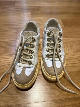Zapatillas de la marca Hogan en tonos beige y blanco. - Diseño acolchado en la parte superior. - Forro interior de pelo sintético. - Cordones gruesos y ojales metálicos.