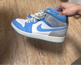 Zapatillas Jordan 1 Mid con una combinación de colores University Blue y Grey. - Diseño de media caña. - Detalles de gamuza gris. - Swoosh azul característico.