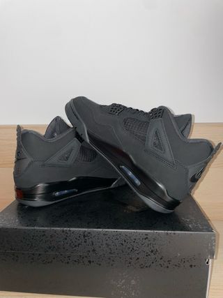 Zapatillas Air Jordan 4 Retro Reimagined en talla 42.5. Un diseño icónico con detalles modernos. - Parte superior en cuero negro y detalles en gris. - Entresuela con amortiguación. - Suela exterior de goma roja.