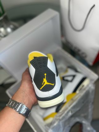 Zapatillas Jordan 4 en talla 43. Combinan blanco y amarillo con detalles en negro. - Diseño icónico. - Materiales de calidad.