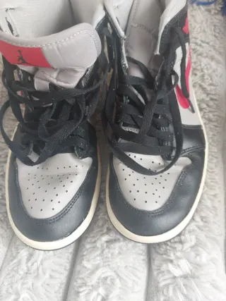 Deportivas altas de la marca Jordan en talla 39. Combinan negro, gris y rojo. - Diseño icónico de Jordan. - Cierre con cordones negros. - Detalle del logo de Jordan en el lateral.