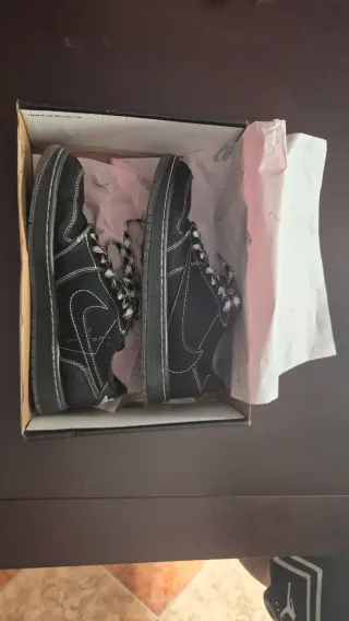 Zapatillas Nike Jordan 1 Low, colaboración con Travis Scott. - Diseño en color negro y blanco. - Cordones apartes negros enteros y rojos