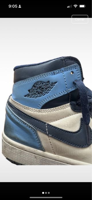 Zapatillas similar a modelo Nike Jordan 1 Retro High en color Blue Chill. Un diseño icónico con acabados brillantes. No son originales. Estan bastante usadas con típico desgaste por uso pero sin grietas ni desperfectos - Combinación de cuero y material sintético. - Cierre con cordones negros. - Suela de goma duradera.