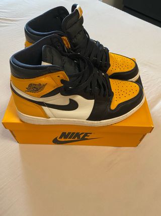 Zapatillas de caña alta Jordan 1. - Combinación de colores negro y amarillo. - Diseño icónico de Jordan.