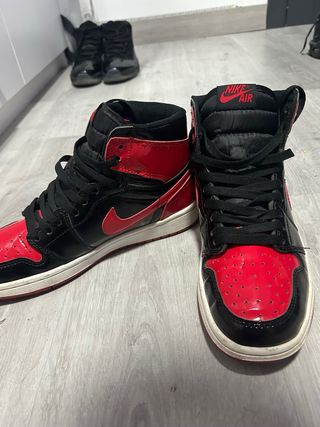 Zapatillas Jordan Retro 1 High OG con acabado patentado en los colores Bred. - Diseño icónico de Jordan. - Combinación de cuero negro y rojo brillante.
