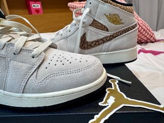 Zapatilla beige con swoosh en elephant print marrón y wings logo en dorado. Trae sticker del jumpman dorado. Super bonitas y muy combinables. Totalmente nuevas, las estrenas tú ! 100% originales.
