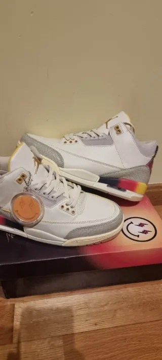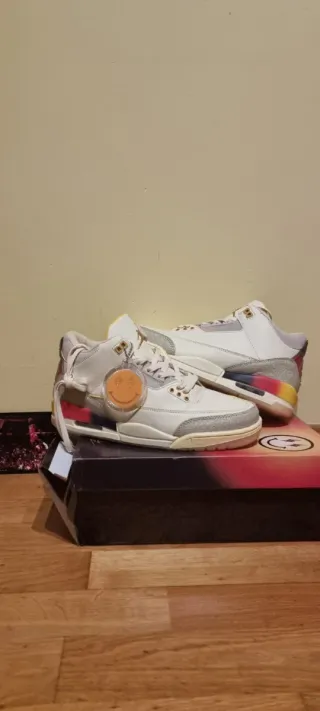 Zapatillas Jordan 3 J Balvin con un diseño llamativo. - Combinación de colores blanco y multicolor. - Detalle de etiqueta con smiley. - Diseño icónico de Jordan 3.