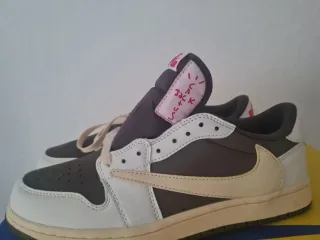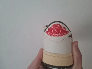Zapatillas Air Jordan 1 Low edición especial Travis Scott. - Diseño icónico con detalles únicos. - Combinación de colores marrón y blanco.