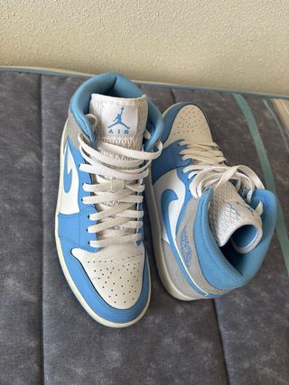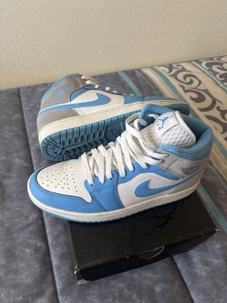 Vendo un par de zapatillas Air Jordan 1 Mid. Son de color azul y blanco, y están en muy buen estado. - Modelo Air Jordan 1 Mid.