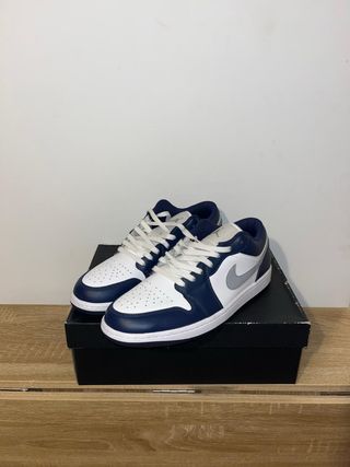 Zapatillas Air Jordan 1 Low con un diseño clásico en azul marino y blanco. - Combinación de colores azul marino y blanco. - Detalle de swoosh plateado.