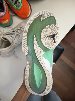 Vendo zapatillas Jordan de un solo uso. - Son de ante. - Tienen detalles en verde y morado. - Vienen con su caja original y cordones negros a juego. El precio se podria negociar.