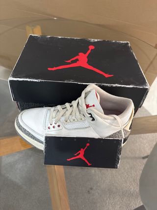 Zapatillas Jordan 3 Retro. - Talla 42.5 - Diseño icónico con detalles en gris y blanco. - Cordones de color crema.