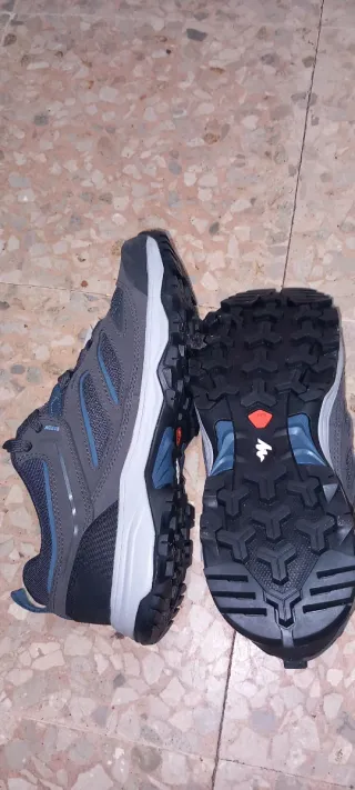 Zapatillas deportivas de la marca Kalenji en tono gris/azul y negro, con suela blanca. Perfectas para el día a día o para actividades deportivas. Pensadas para trekking ligero. - Diseño moderno y funcional. - Materiales transpirables. Poco usadas. Talla 45 (estás zapatillas tienen un tallaje un poco justo). Usadas varias veces, hasta que quedó claro que el tallaje no era el que necesitaba (por desgracia fuera de tiempo para cambiarlas).
