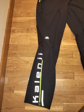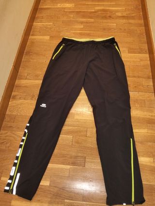 Pantalón de running Kalenji (Decathlon) Color negro con cremalleras verdes. Con bolsillos con cremallera y bajos con apertura para poner/quitar zapatillas fácilmente. Detalles reflectantes para mayor visibilidad. En muy buen estado, apenas usado.