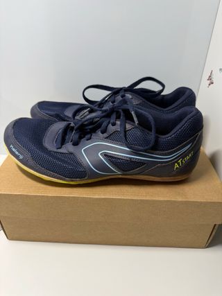 Zapatillas de atletismo Kalenji en color azul con detalles en amarillo. No incluye clavos. Se pueden comprar en Decathlon - Talla 39. - Diseño ligero y transpirable. - Suela con buen agarre.
