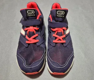 Zapatillas deportivas de la marca Kalenji. - Diseño en color morado y blanco. - Cierre con velcro para un ajuste fácil.