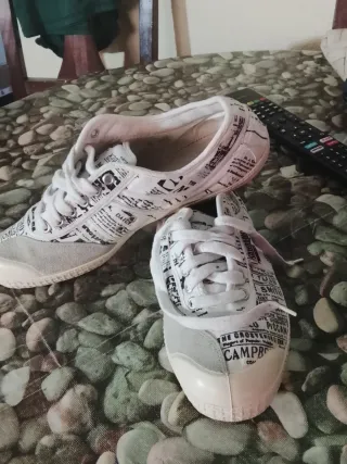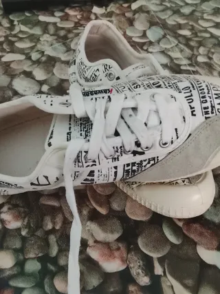Zapatillas de lona con un diseño original. Puntera reforzada. - Estampado tipo periódico. - Combinación de colores gris y blanco. - Cierre con cordones. Descuento del 10% en dos o más artículos de mis anuncios y 25% a partir de 5