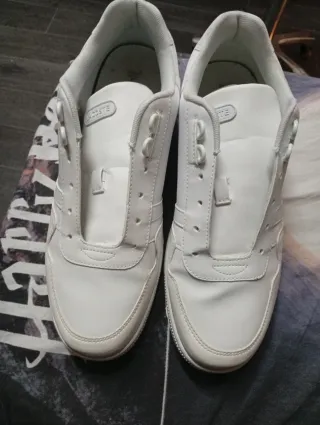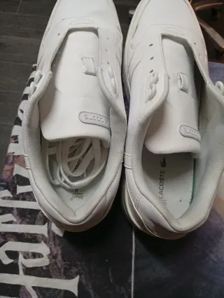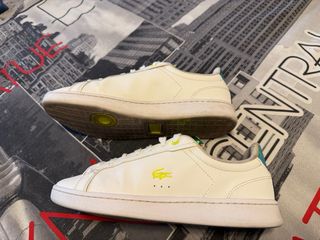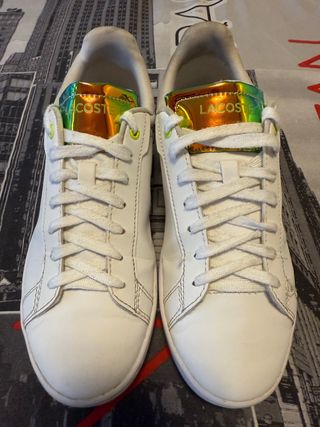 Vendo un par de zapatillas Lacoste. Son de color blanco y tienen un diseño clásico. Están ligeramente usadas, como se puede apreciar en las fotos. - Suela de goma. - Detalle tricolor en el talón diferente. - cada zapatilla tiene un diseño distinto