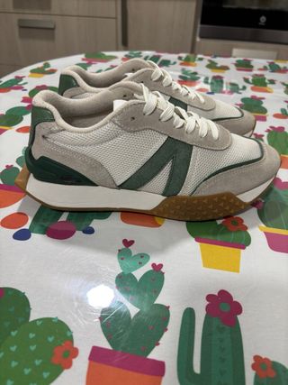 Zapatillas de estilo casual con un diseño moderno. - Combinación de colores beige y verde. - Materiales de calidad para mayor comodidad. - Detalle del logo de Lacoste.