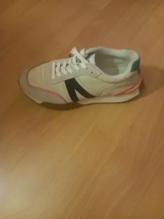 Zapatillas de estilo deportivo con un diseño moderno. - Combinación de colores blanco y rosa. - Detalle de banda en color negro en el lateral. - Acabado en la parte trasera en verde. Tiene algo de uso, pero no hay roturas