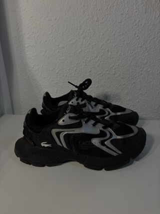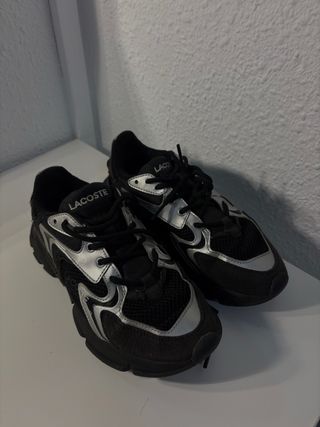 Zapatillas deportivas Lacoste con un diseño moderno y detalles llamativos. - Combinación de colores negro y plateado. - Materiales textiles y sintéticos.