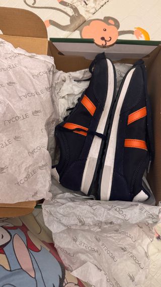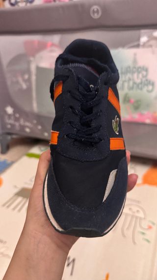 Zapatillas deportivas de la marca Lacoste. - Diseño en color azul marino con detalles en naranja. - Suela blanca. - Cierre con cordones. - poco usado. -Solo un daño, pero es tan pequeño que está en la foto. Y solo necesita limpieza